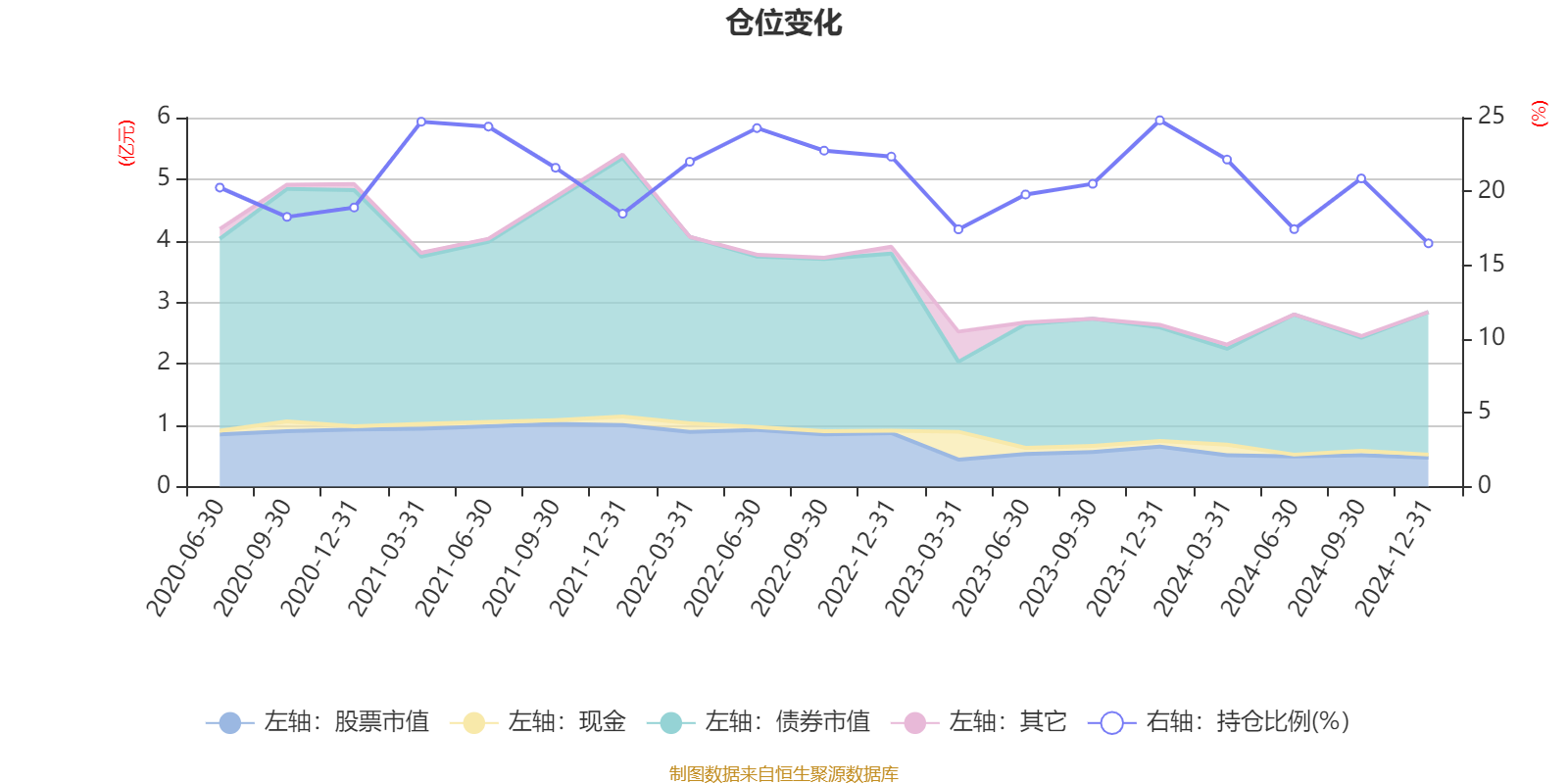 据定期报告数据统计,近三年平均股票仓位为20.91%,同类平均为18.69%。2023年末基金达到24.82%的最高仓位,2024年末最低,为16.48%。