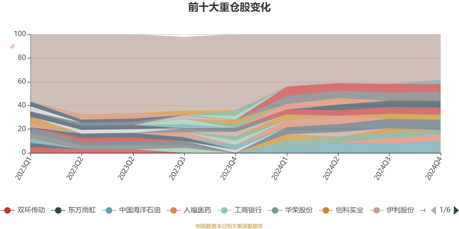截至2024年四季度末,基金十大重仓股分别是中国海洋石油、宝丰能源、腾讯控股、贵州茅台、美的集团、华润万象生活、人福医药、五粮液、华荣股份、新秀丽。
