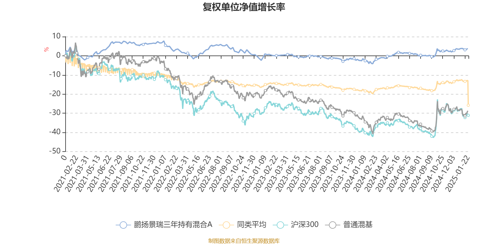 截至1月21日,鹏扬景瑞三年持有混合A近三个月复权单位净值增长率为1.13%,位于同类可比基金346/670;近半年复权单位净值增长率为2.85%,位于同类可比基金420/670;近一年复权单位净值增长率为7.20%,位于同类可比基金283/664;近三年复权单位净值增长率为-1.26%,位于同类可比基金379/525。